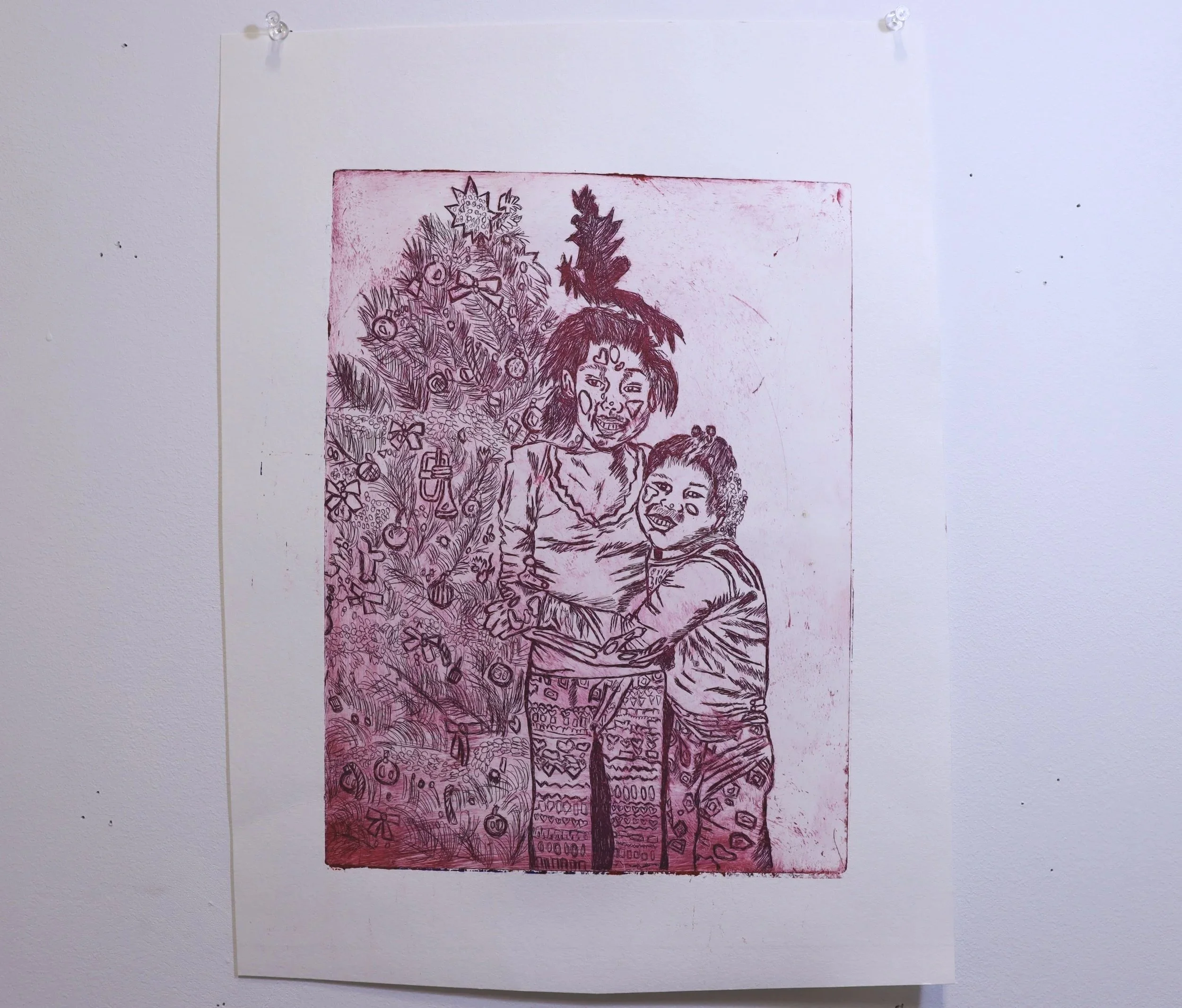 The print was made from an etching and aquatint I made on a copper plate of me and my sister. The inspiration was from a photo my mother took of me and my sister on Christmas morning of 2012, about a month after we moved to Connecticut from New Jersey. I was 8 years old, my sister was 12 years old. While creating this piece I was drawn to remember that precious memory of my sister and I and our close relationship to one another. I also was able to remember the state of my family at that time and how we were essentially homeless and living with my grandma and great-grandma in their senior living apartment. The time period was a rough patch for my family and I, and the turmoil we were feeling that day with my father’s alcoholism. That Christmas was pure white, covering every area of sight. I wanted the print to be blue and show the changes I made in the aquatint process. The print, however, was a happy accident of too much blue ink absorbed to the paper. Chaos during a blue Christmas.